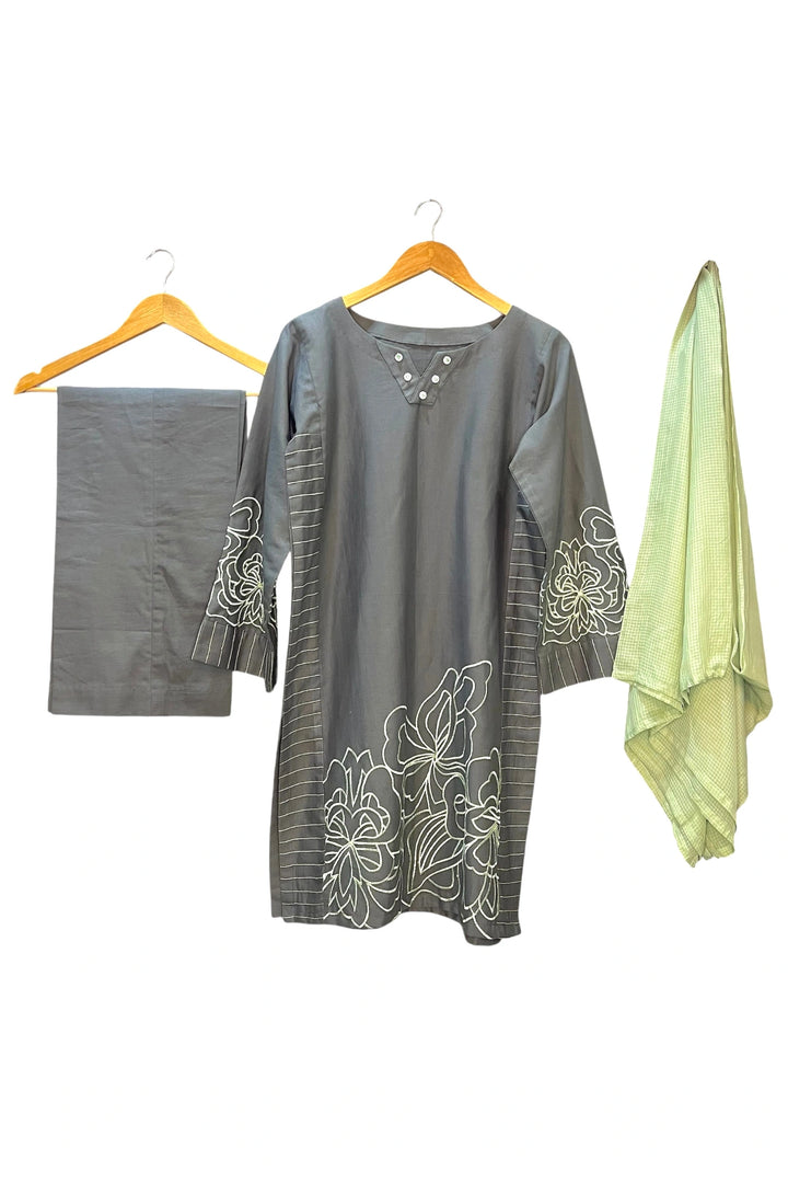Make a striking style statement with this Charcoal Grey 2 Piece, beautifully accented with Neon Green details. Crafted from soft khaddar, the outfit offers cozy comfort for cooler days, paired with a flowy self-printed chiffon dupatta that adds effortless grace to your look.